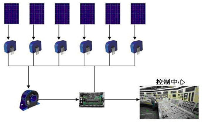 WBI021TK02-3產(chǎn)品采用閉環(huán)霍爾效應(yīng)原理,用于精密測(cè)量直流、交流和脈沖電流,將其變換為標(biāo)準(zhǔn)的跟蹤電壓輸出;具有體積小, 響應(yīng)速度快, 動(dòng)態(tài)性能好,過載能力強(qiáng),高精度、高隔離、高可靠、低漂移等特點(diǎn)。產(chǎn)品對(duì)每一路的光伏電池板電流進(jìn)行監(jiān)測(cè),根據(jù)光伏匯流箱的路數(shù)不同進(jìn)行匹配。采用5V單電源供電,輸出信號(hào)為2.5V±0.625V,輸出的信號(hào)給采集裝置,通過采集板轉(zhuǎn)換,最終送到監(jiān)控室,監(jiān)控中心統(tǒng)一對(duì)每個(gè)陣列的電池板發(fā)電情況進(jìn)行實(shí)時(shí)在線監(jiān)測(cè),使工作人員及時(shí)對(duì)出現(xiàn)問題電池板進(jìn)行處理。系統(tǒng)架構(gòu)如下圖:
