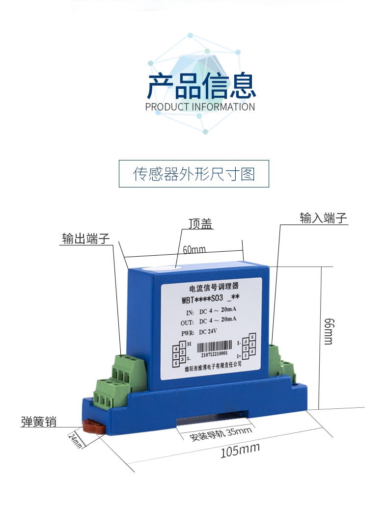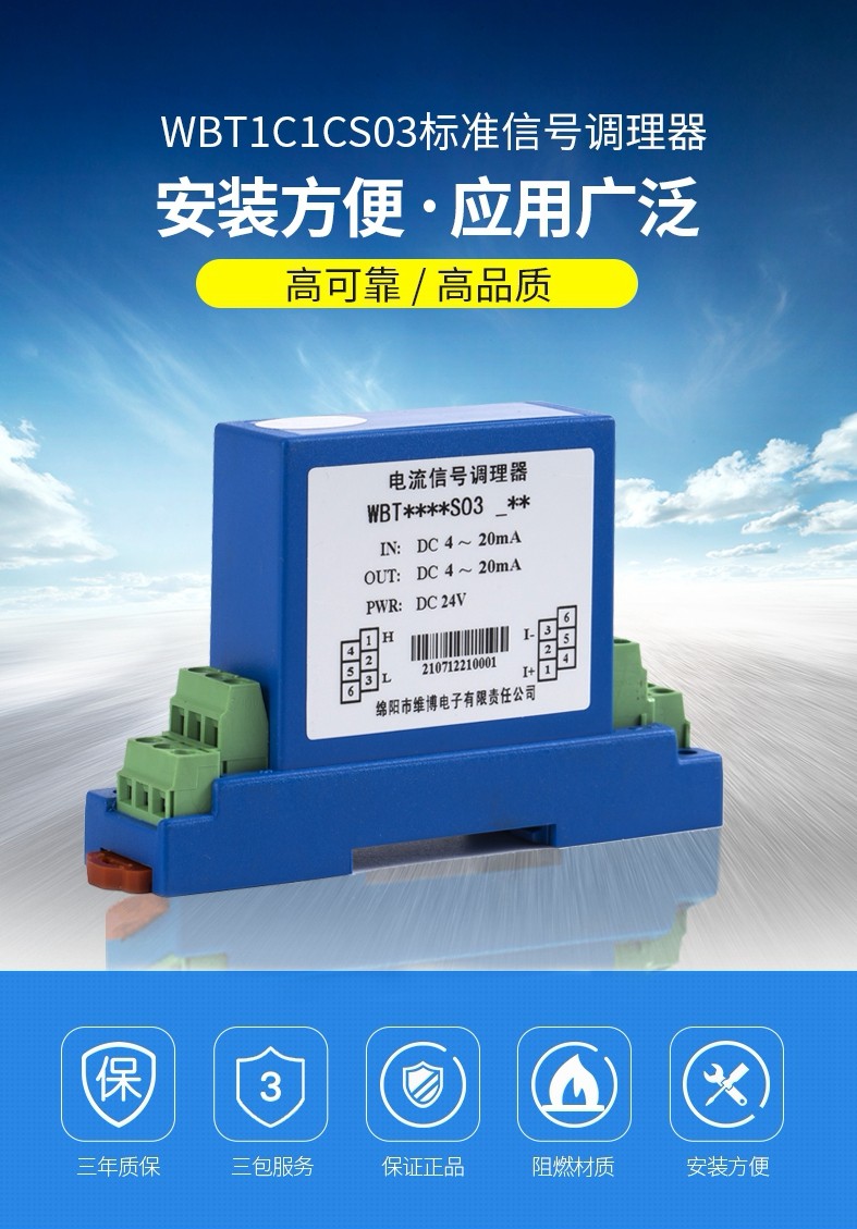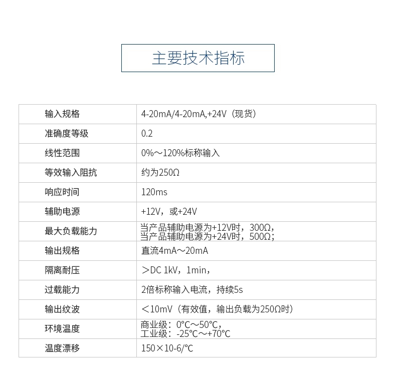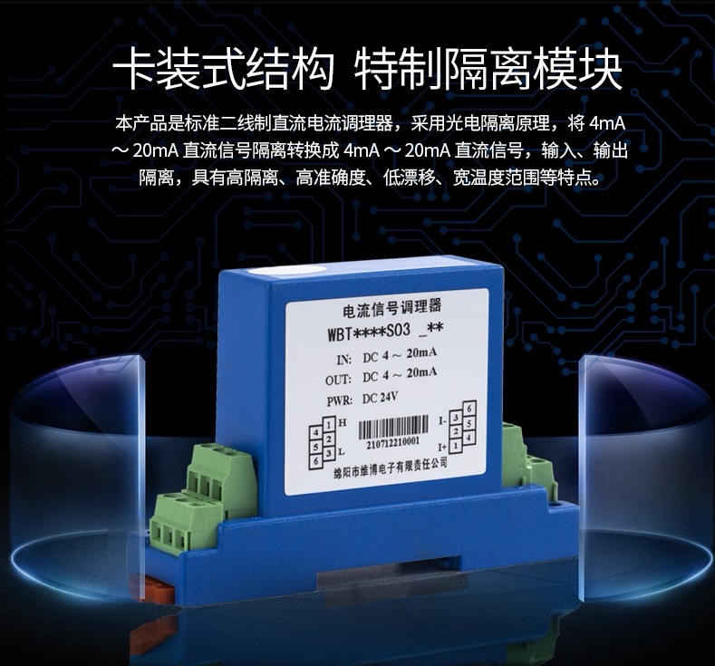 本產(chǎn)品是標(biāo)準(zhǔn)二線制直流電流調(diào)理器,采用光電隔離原理,將4mA~20mA直流信號隔離轉(zhuǎn)換成4mA~20mA直流信號,輸入、輸出隔離,具有高隔離、高準(zhǔn)確度、低源移、寬溫度范圍等特點(diǎn)。